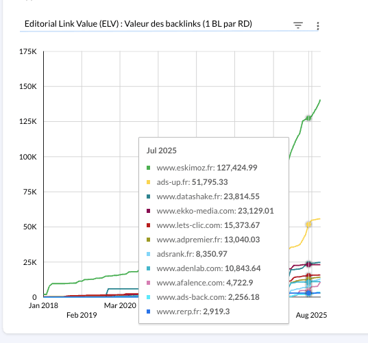On constate que les 3 premiers ont des valeurs de backlinks très élevé et ont continué à investir de grosse somme en netlinking en 2025.
