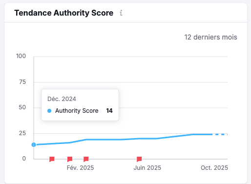 Si on jette un oeil sur Semrush et leur métrique Authority Score, on constate qu'elle est assez basse en décembre 2024 :