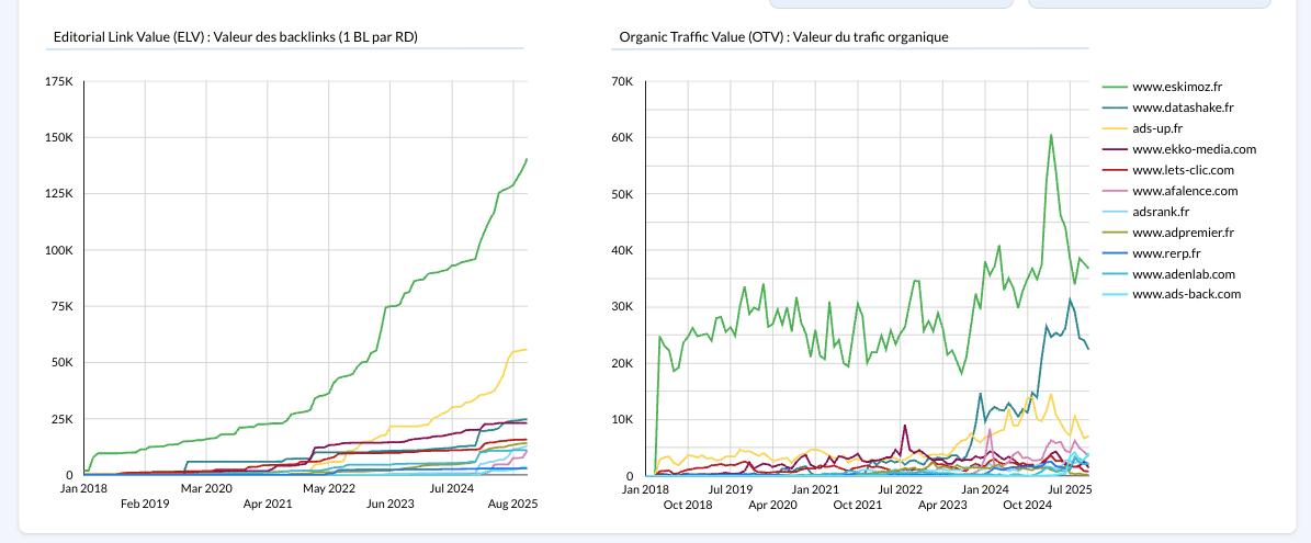 On constate que le premier (eskimoz.fr) est bien le leader en trafic et en backlink.