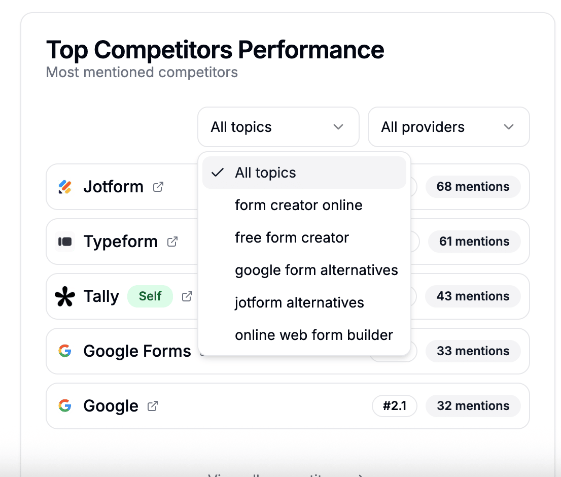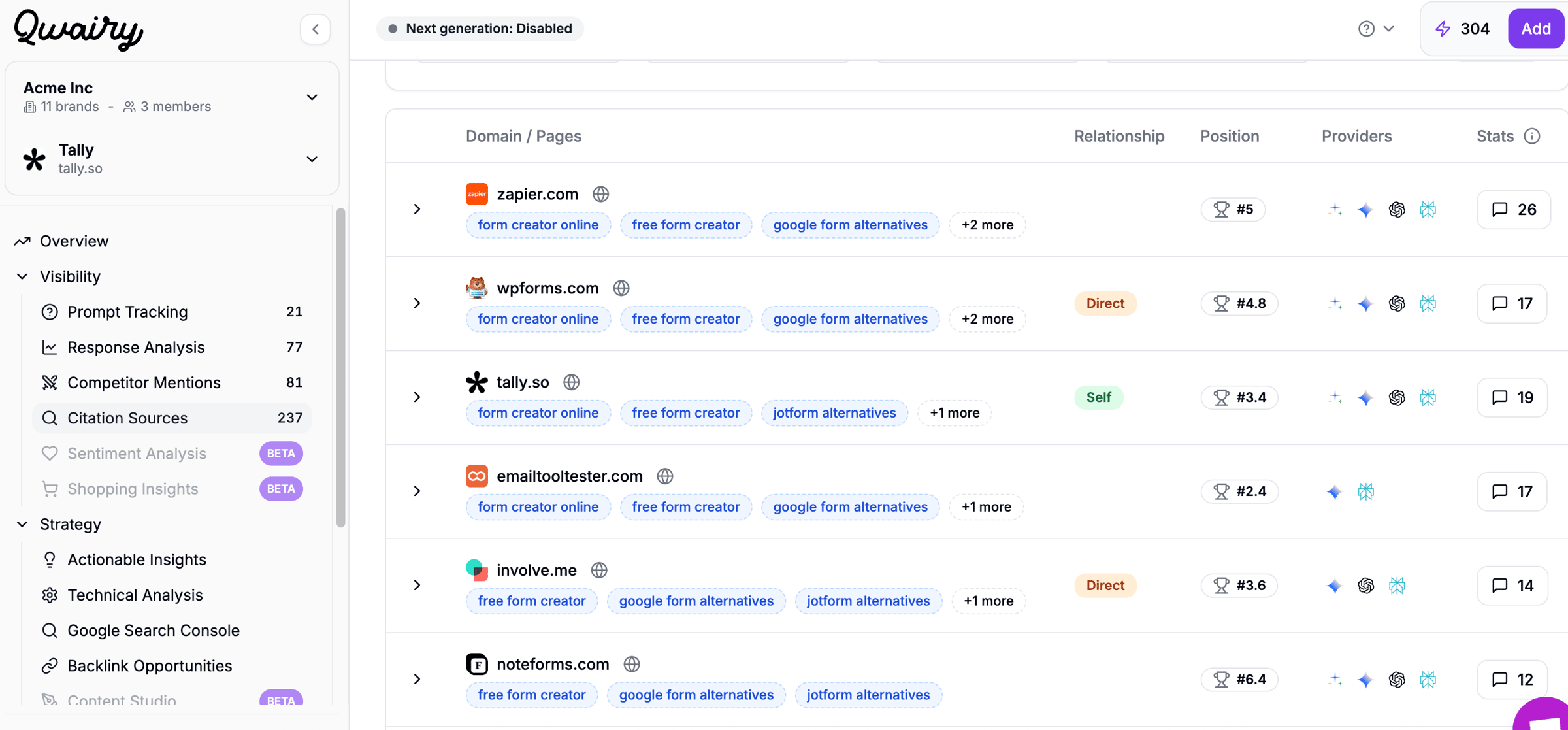 En observant les sources utilisées par les LLMs, j'ai constaté que Tally a créé des pages de contenu stratégiques comme "Best free online form builders in 2025" et "Jotform alternatives" qui sont fréquemment utilisées comme sources par ChatGPT.