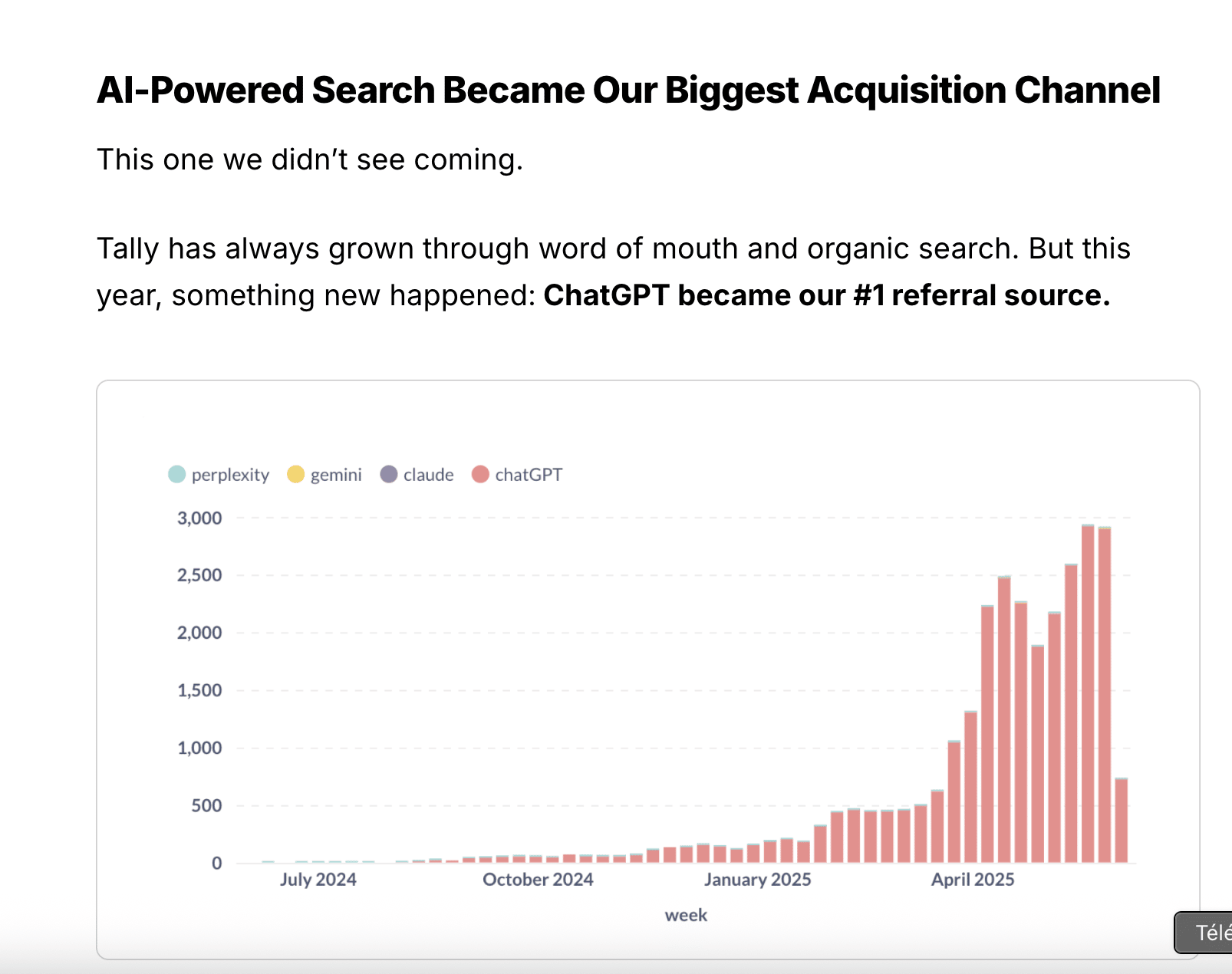 Tally a récemment partagé qu'ils étaient passés de 2 à 3 millions d'ARR et que ChatGPT était devenu leur premier canal d'acquisition.